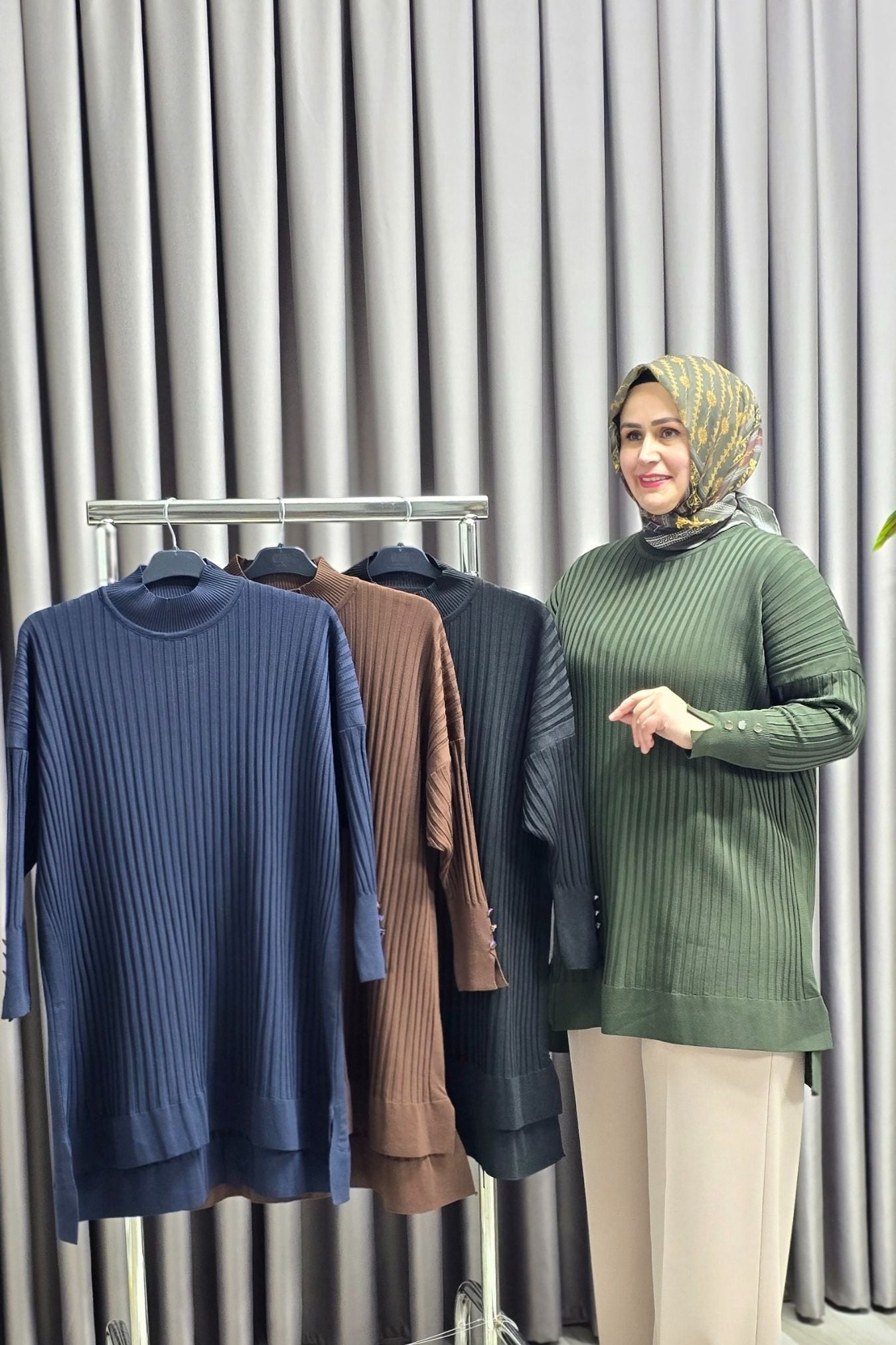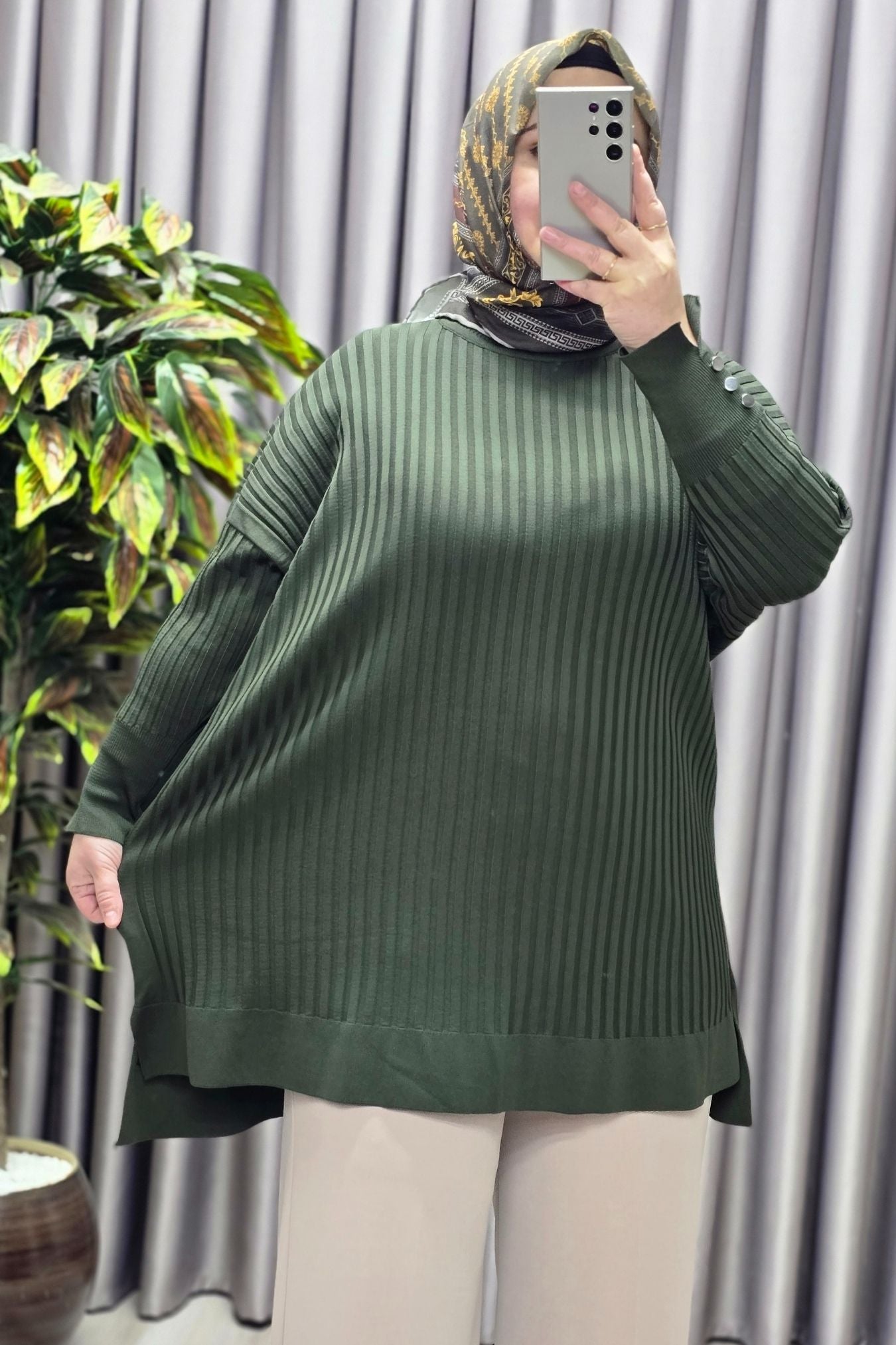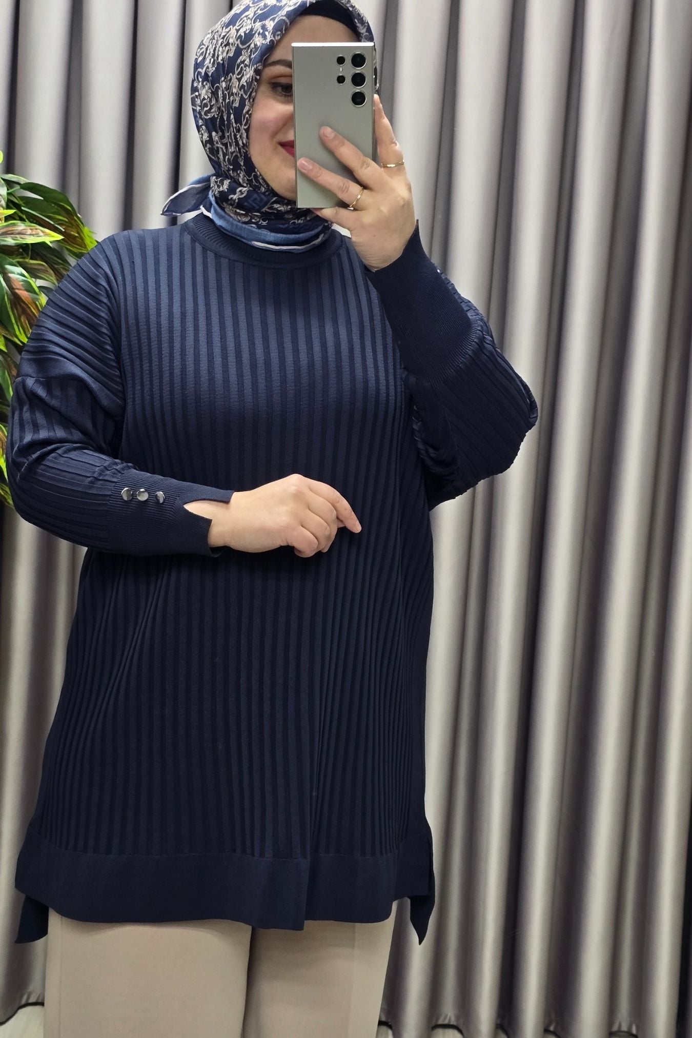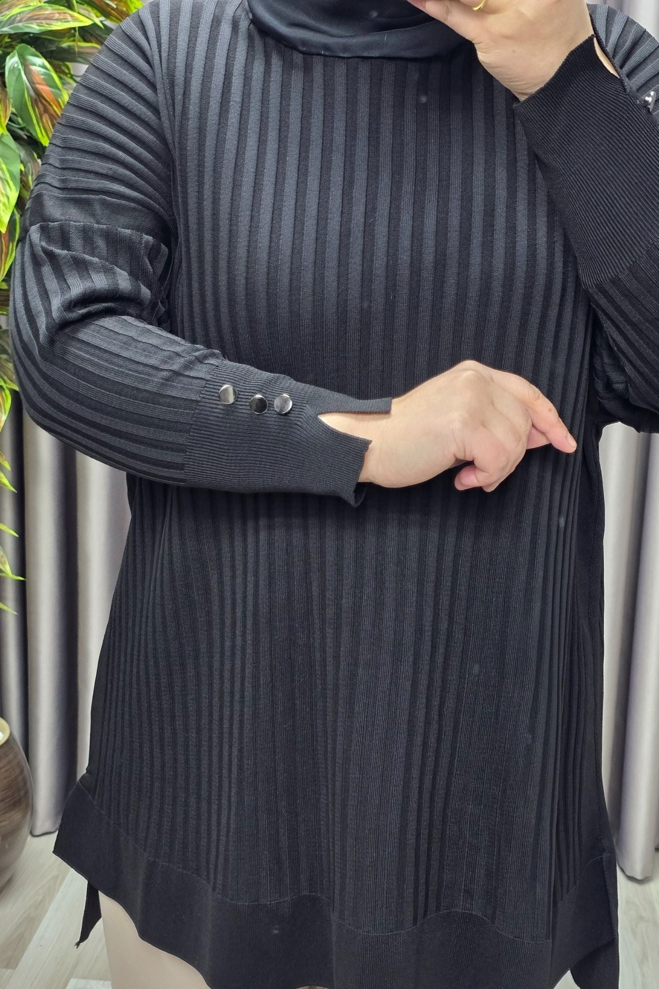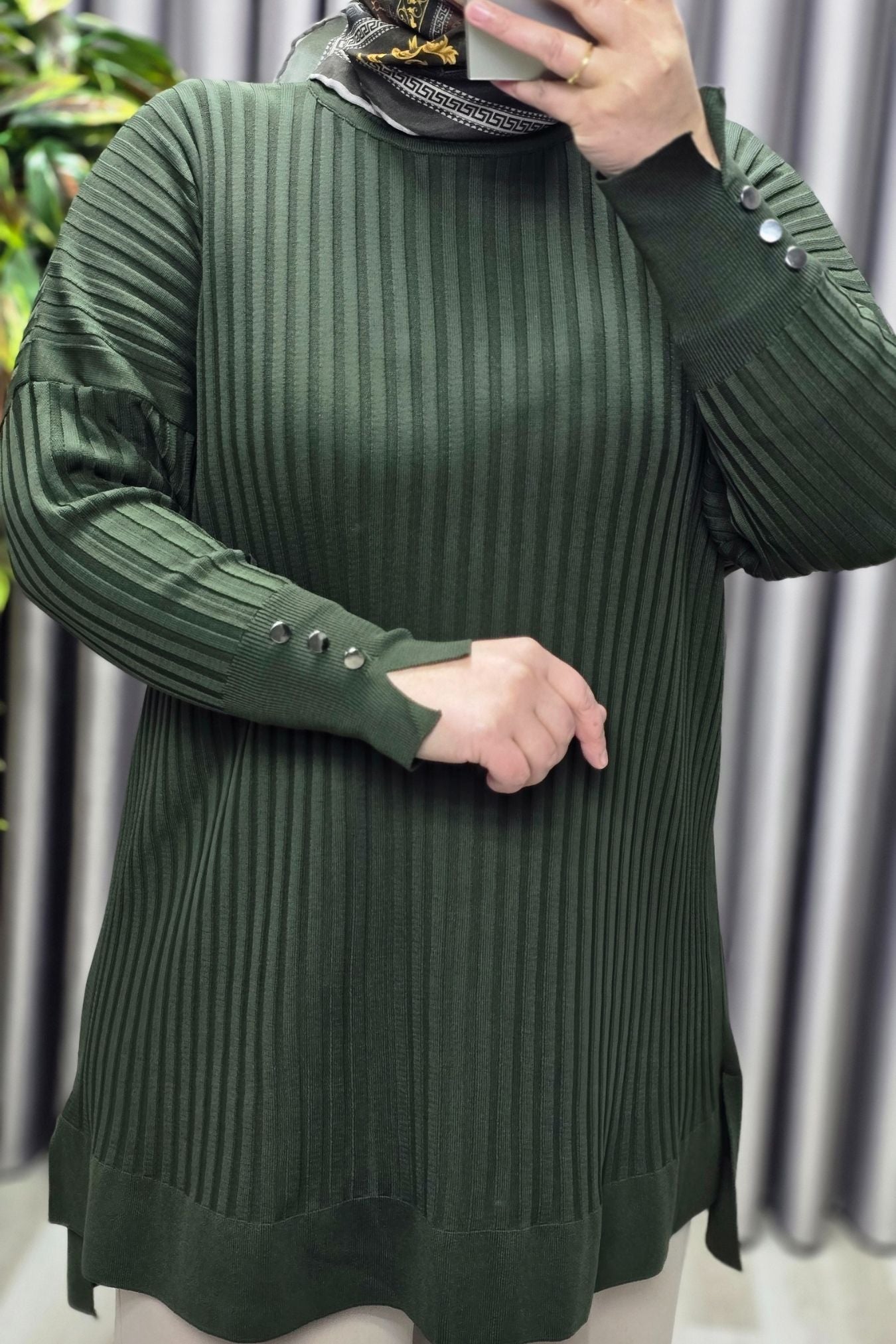 Kadın Giyim Büyük Beden Kolu Düğmeli Fitilli Standart Beden Triko Tunik