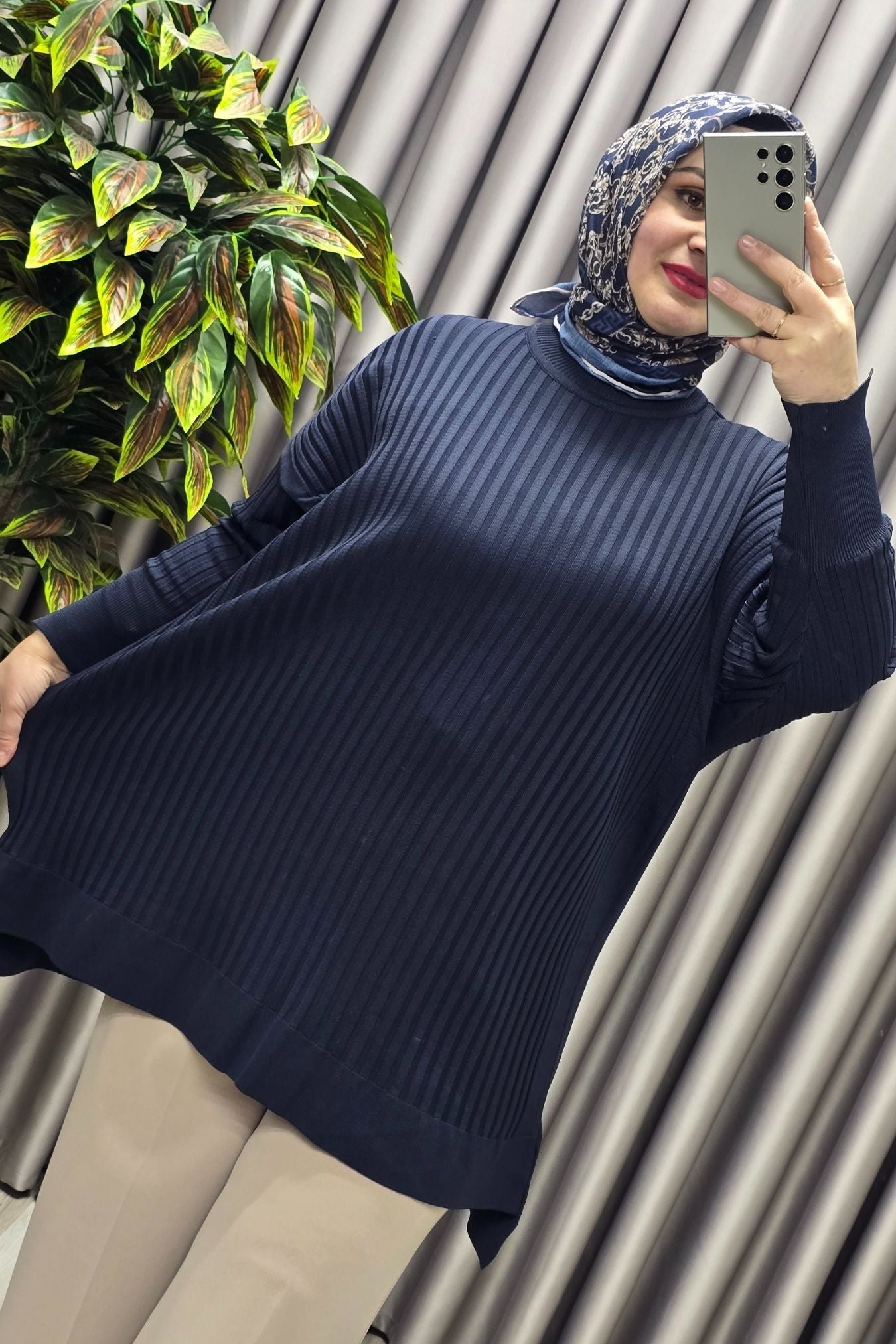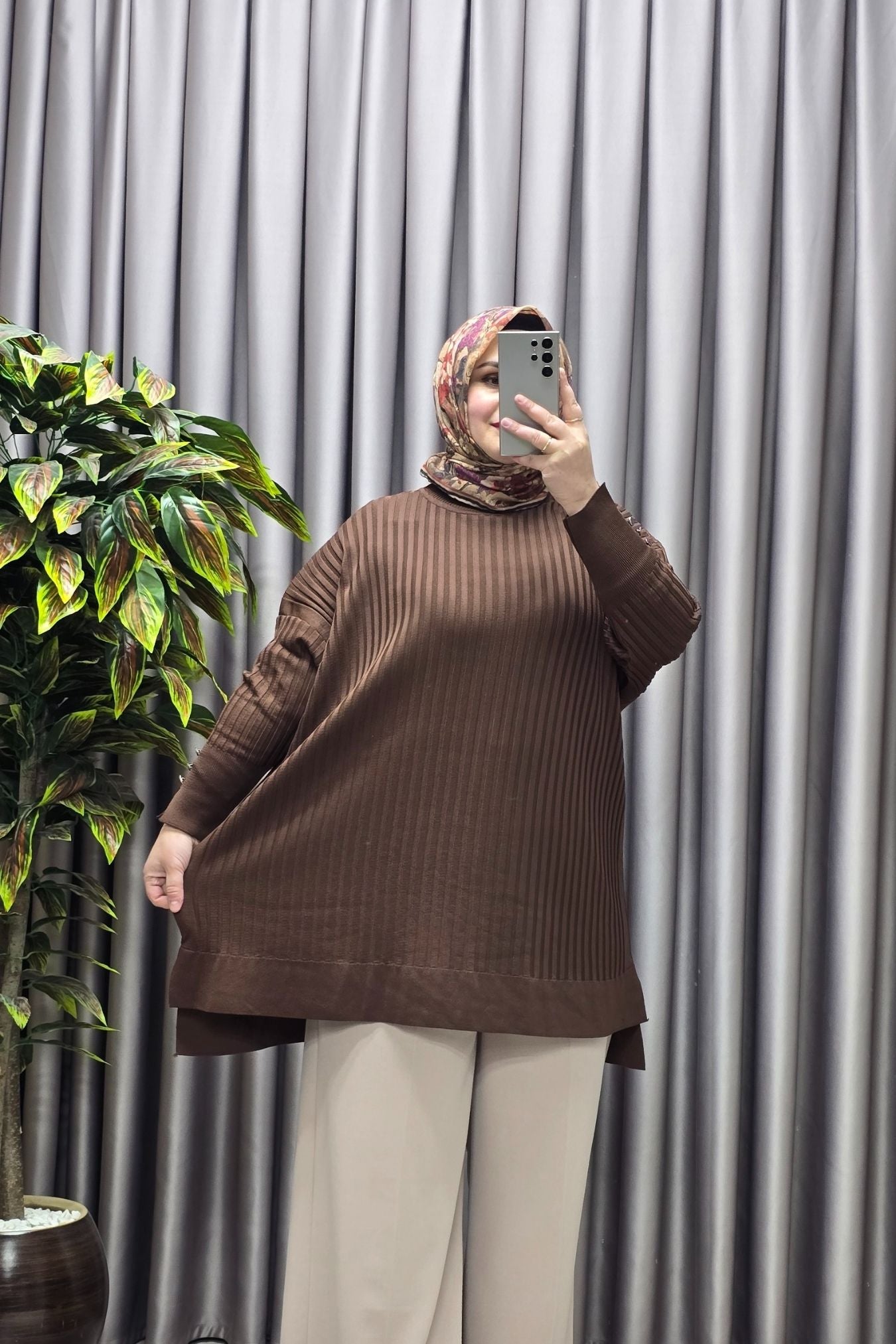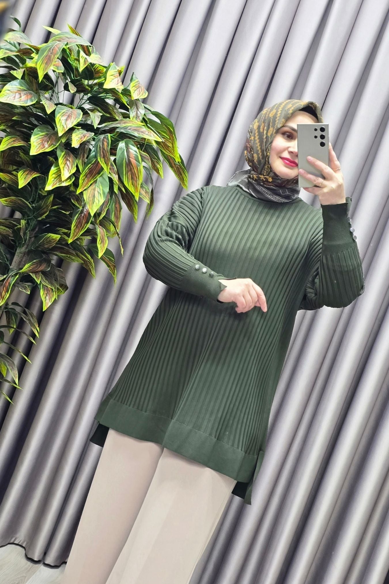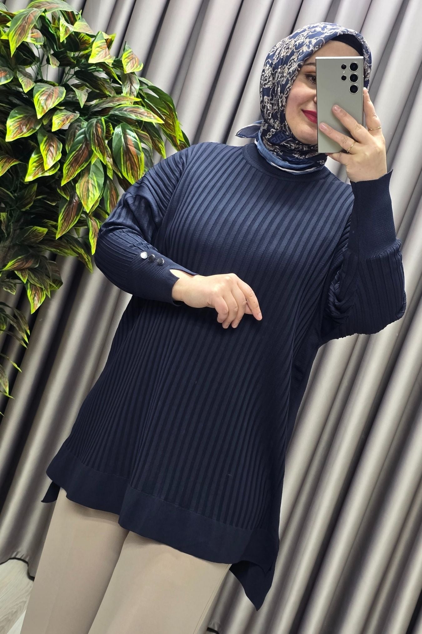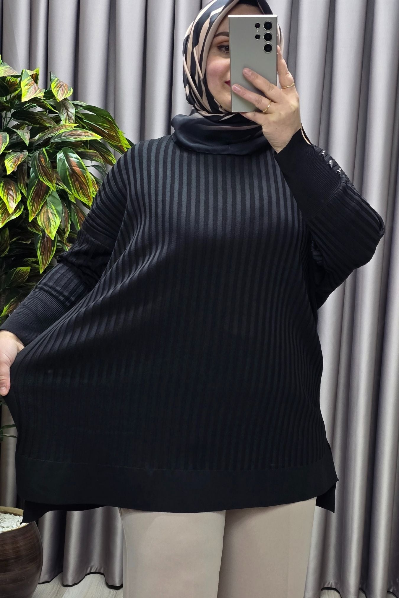 Kadın Giyim Büyük Beden Kolu Düğmeli Fitilli Standart Beden Triko Tunik