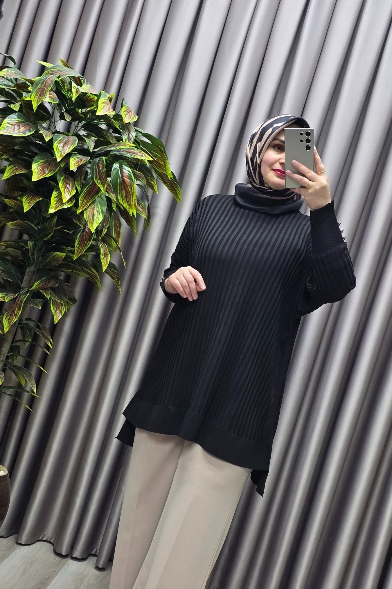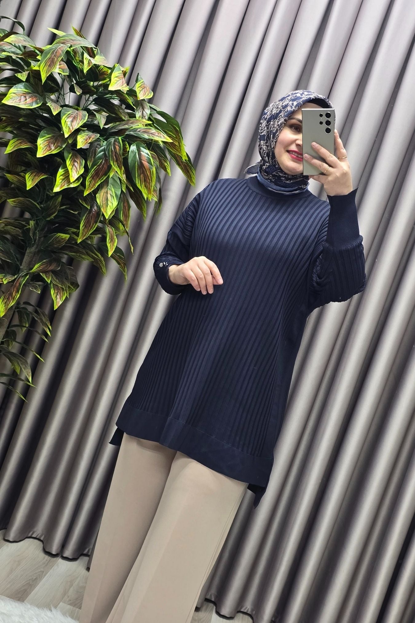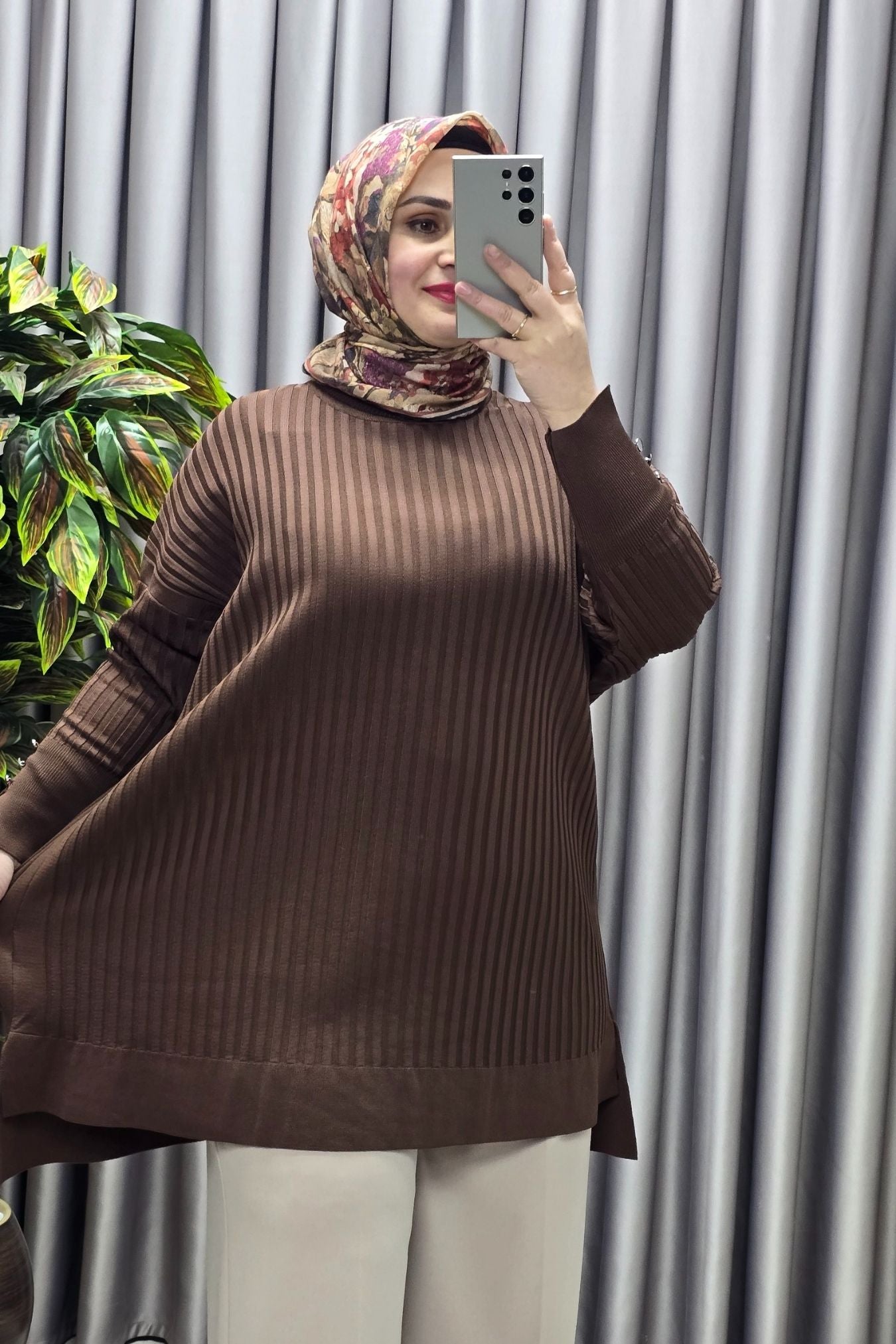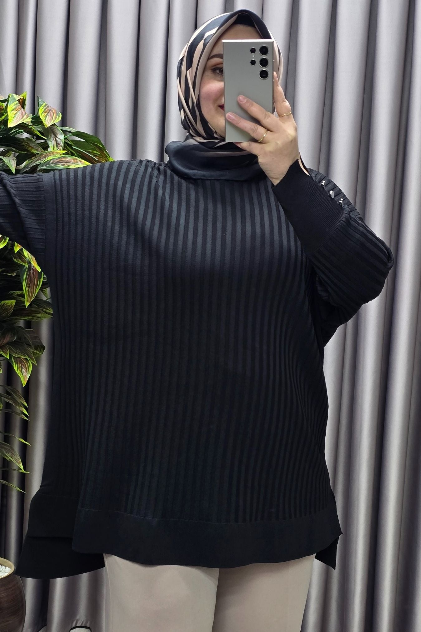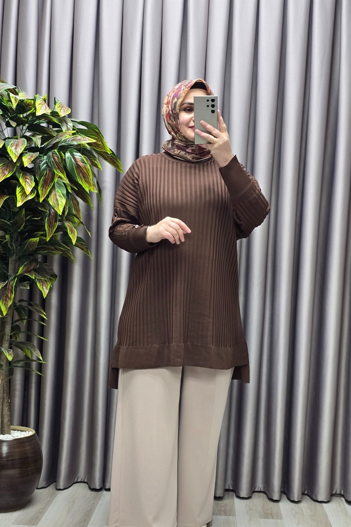 Kadın Giyim Büyük Beden Kolu Düğmeli Fitilli Standart Beden Triko Tunik