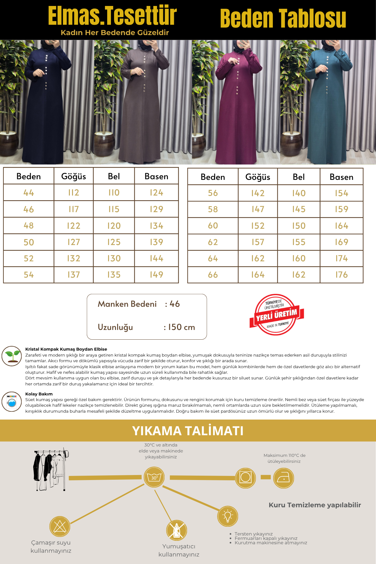 Zarafeti ve modern şıklığı bir araya getiren kristal kompak kumaş boydan elbise, yumuşak ve dökümlü yapısıyla her bedende kusursuz bir siluet oluşturur. Büyük beden tesettür elbise modelleri arasında öne çıkan bu parça, hafif dokusu sayesinde gün boyu konfor sunarken asil duruşuyla tarzınızı mükemmel şekilde tamamlar.