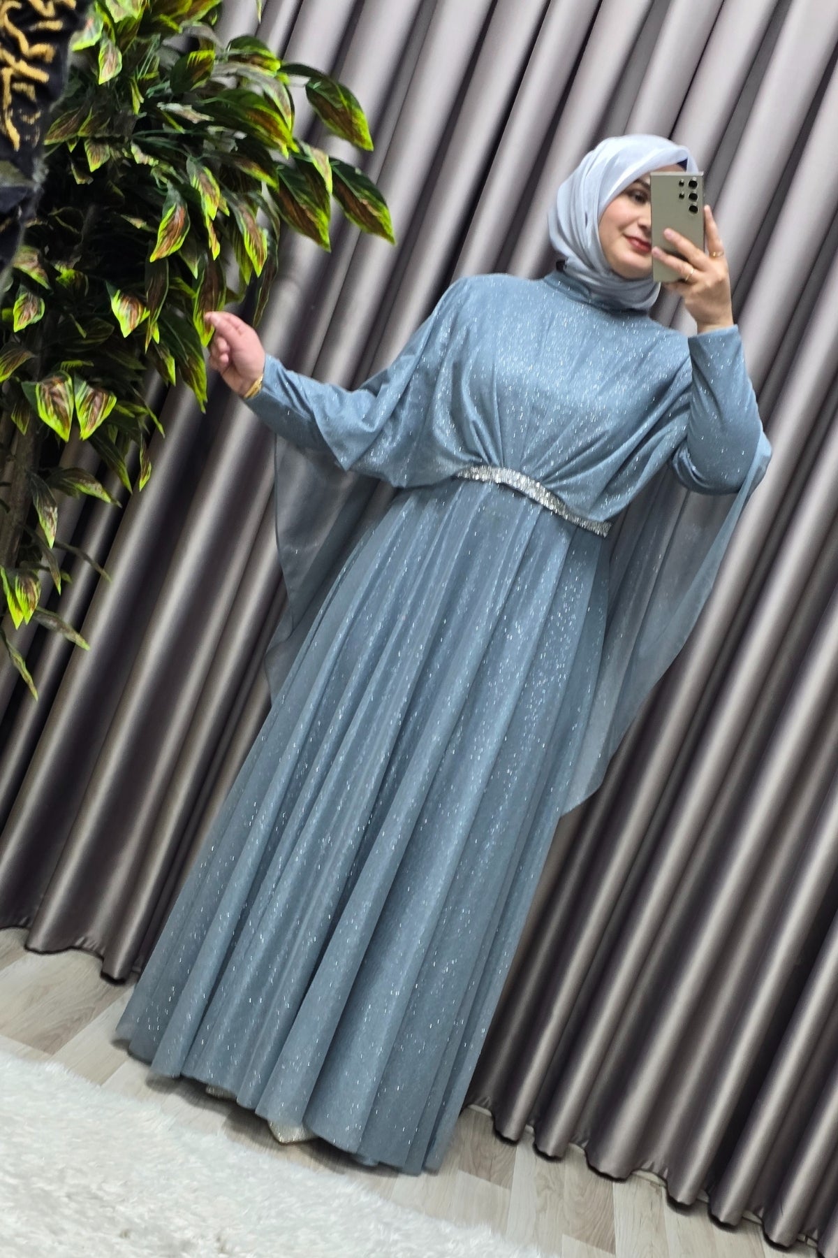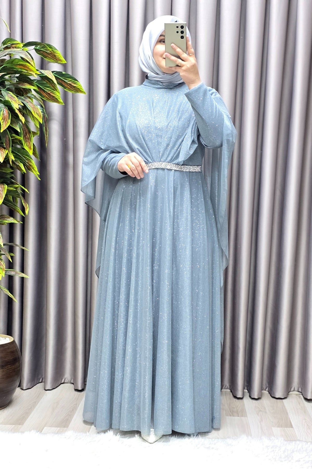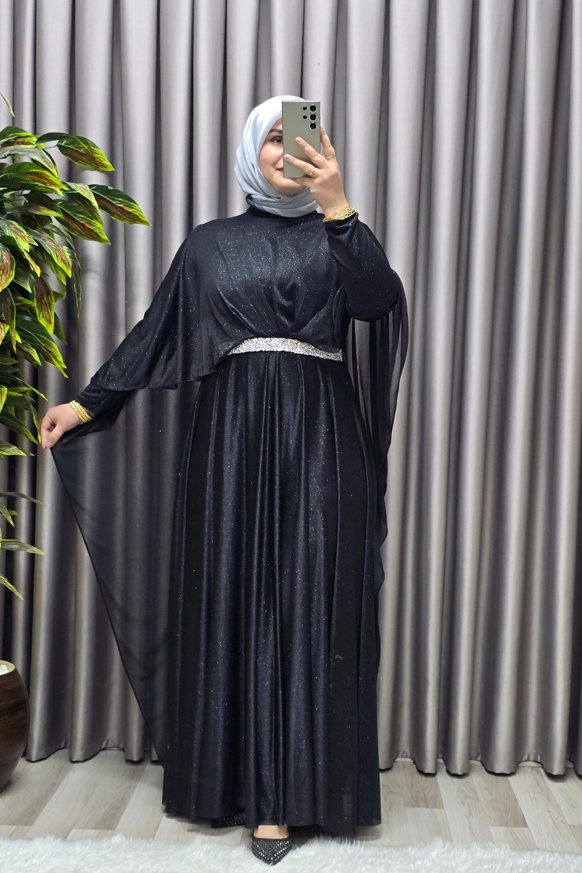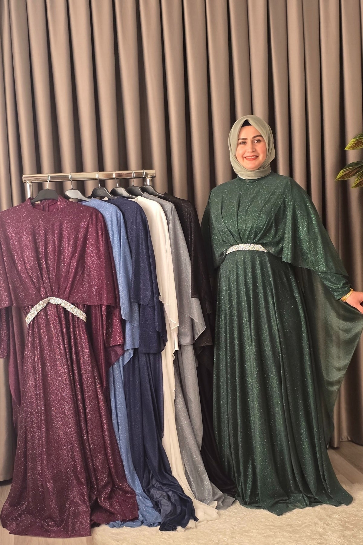 - Zarif renkleriyle göz alıcı bir görünüm sunan bu pelerinli abiye, her özel anınızda şıklığınızı tamamlar.