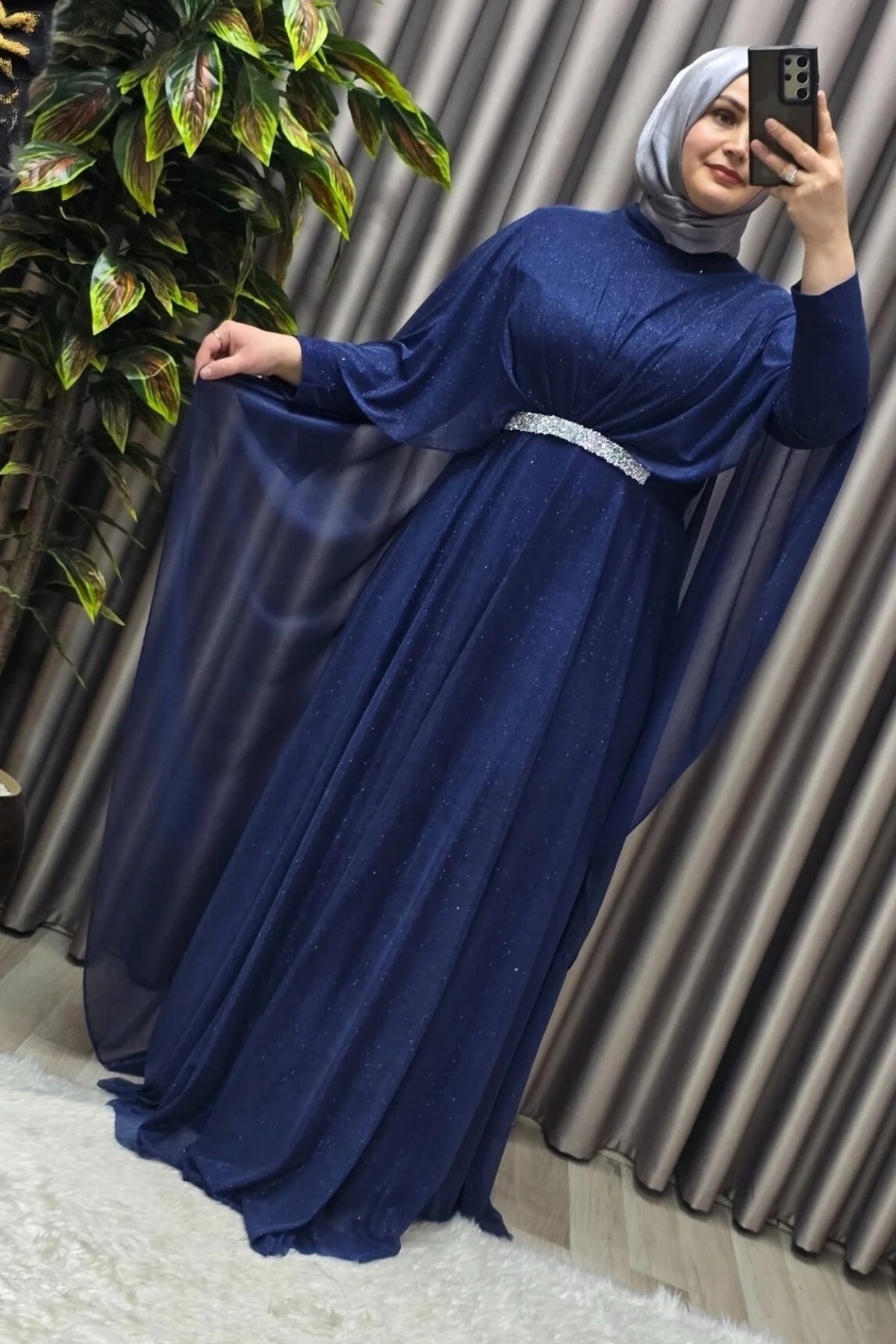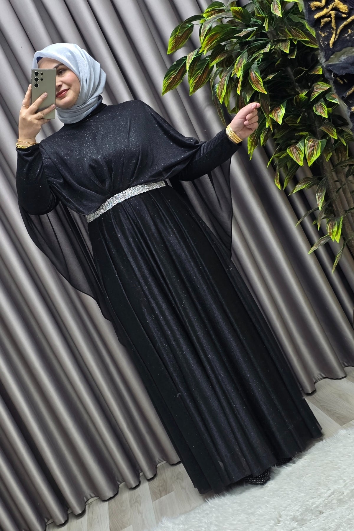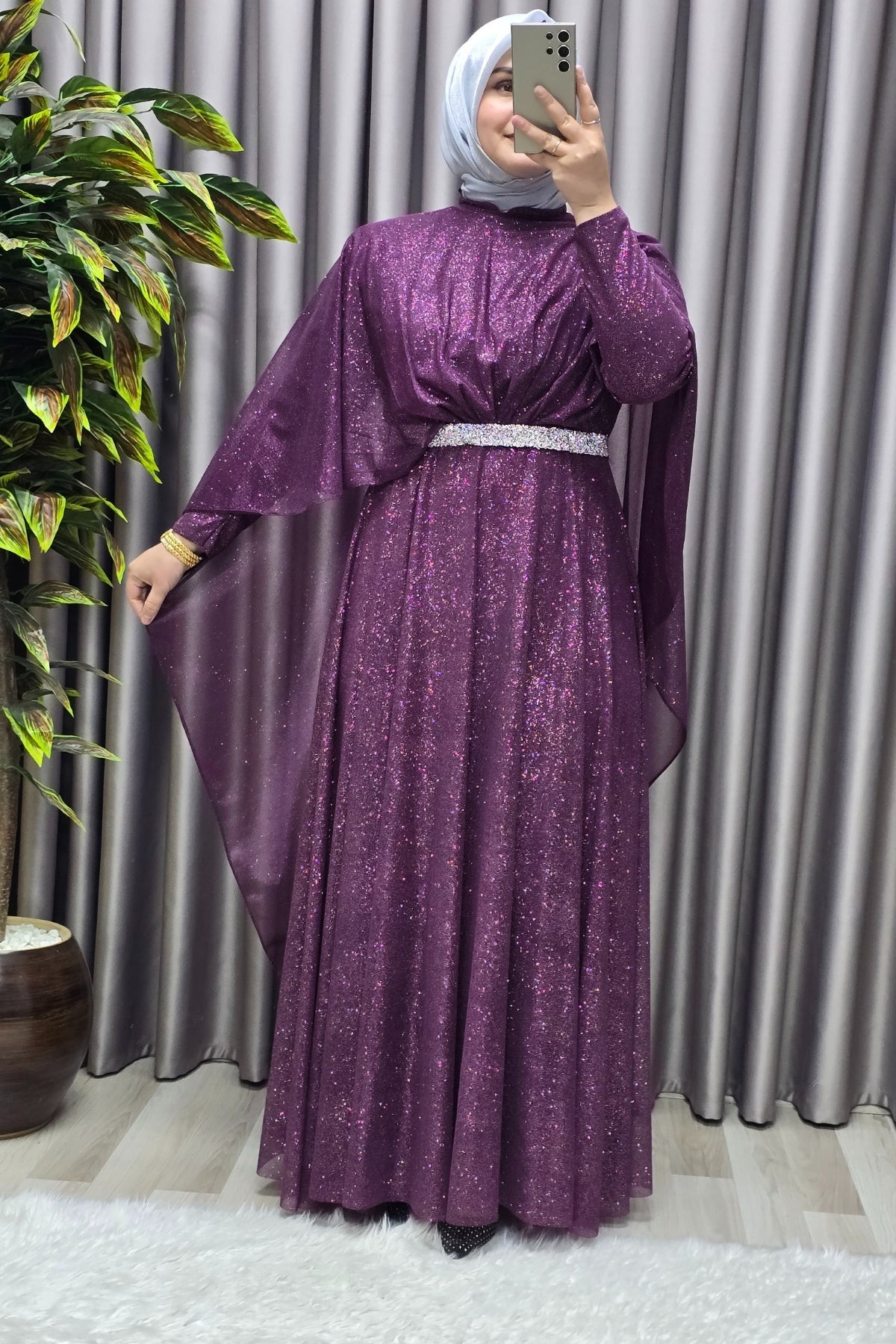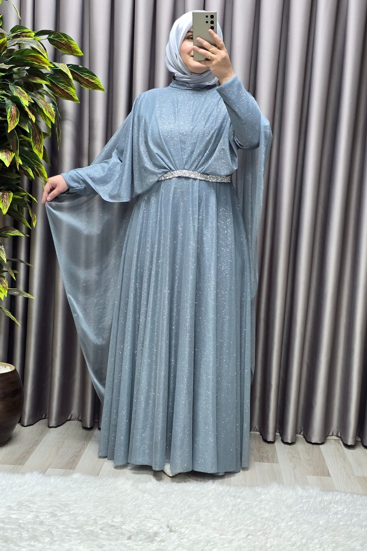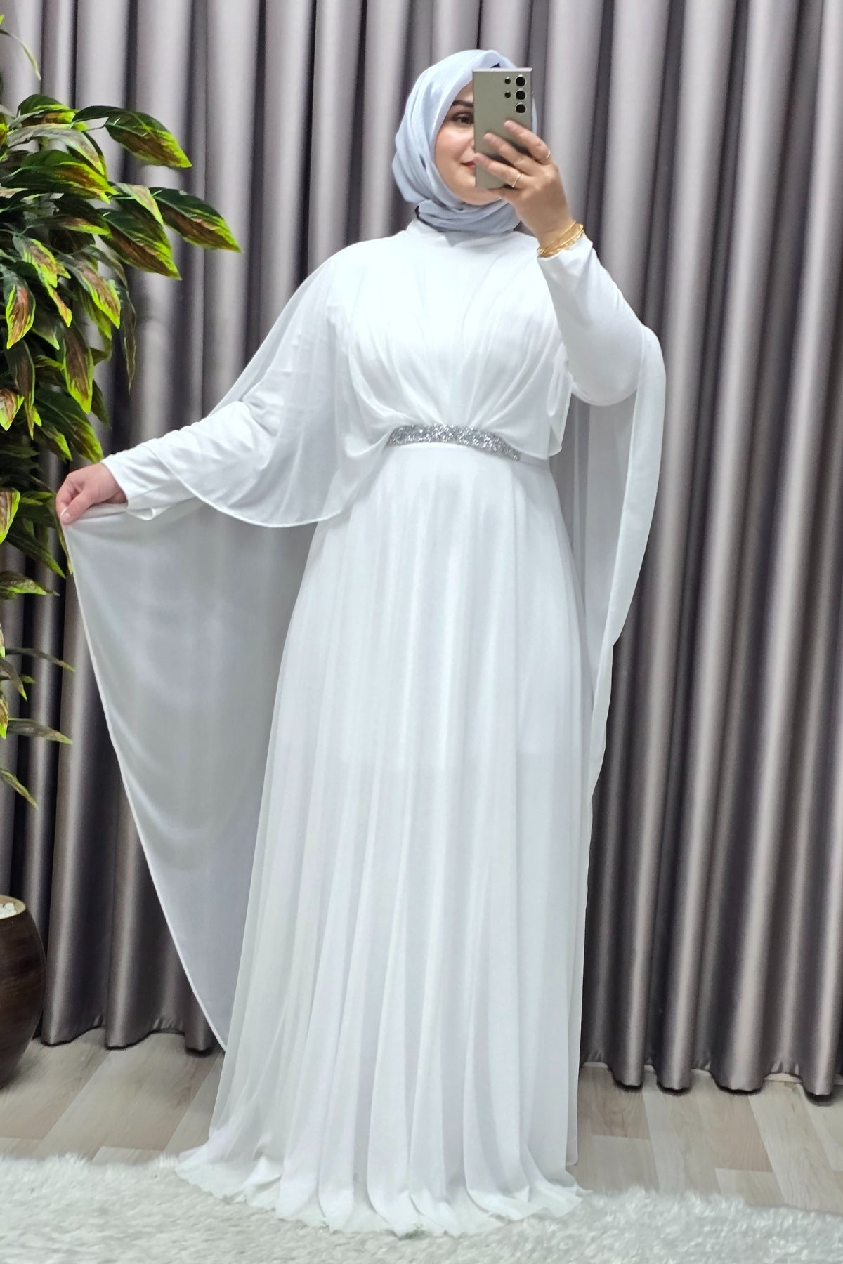 - Zarif renkleriyle göz alıcı bir görünüm sunan bu pelerinli abiye, her özel anınızda şıklığınızı tamamlar.