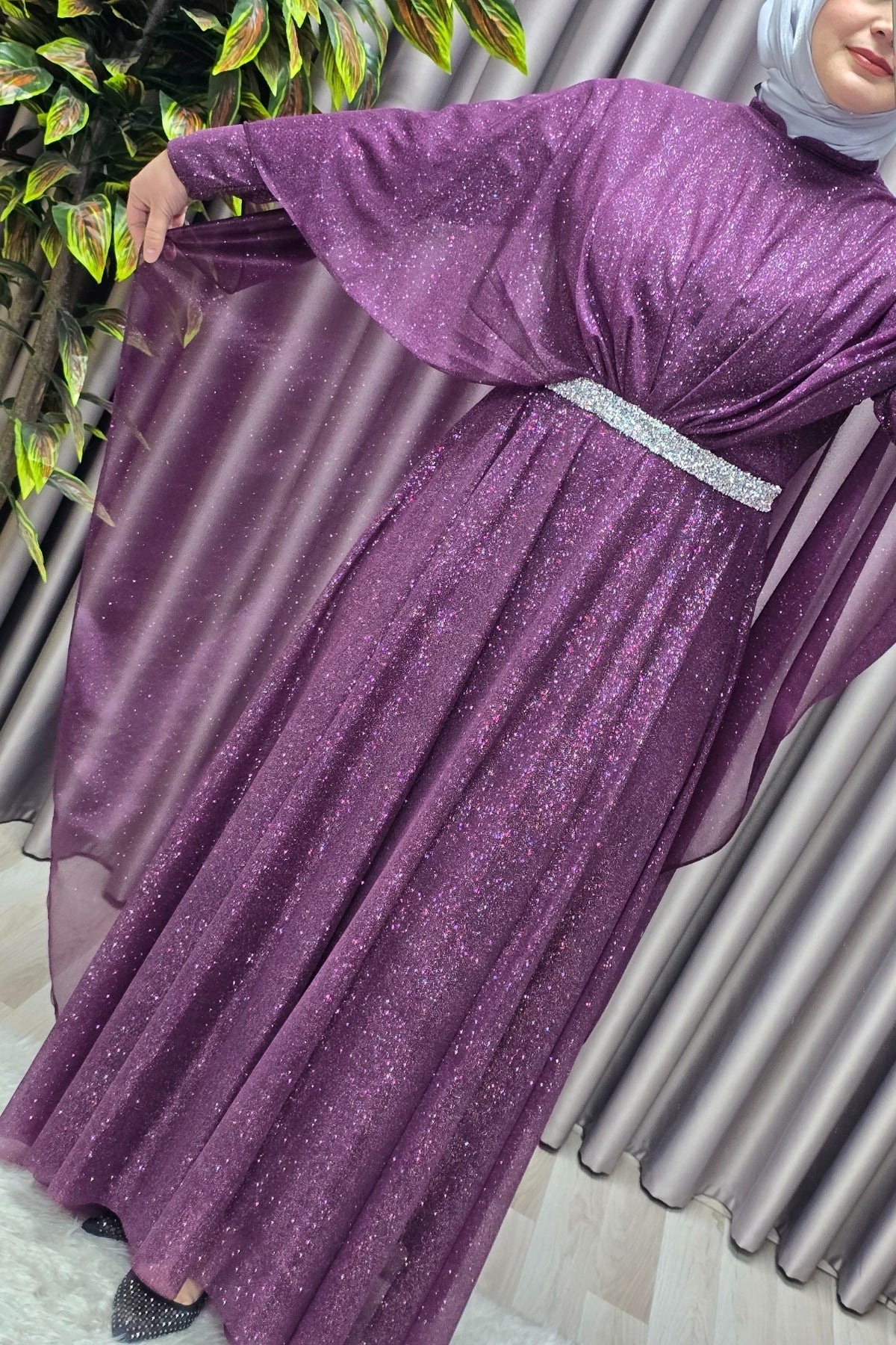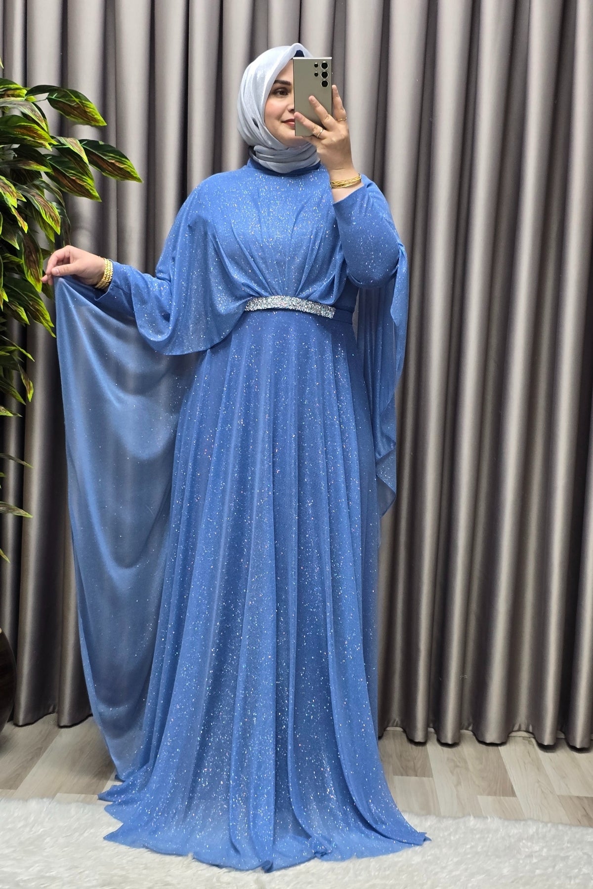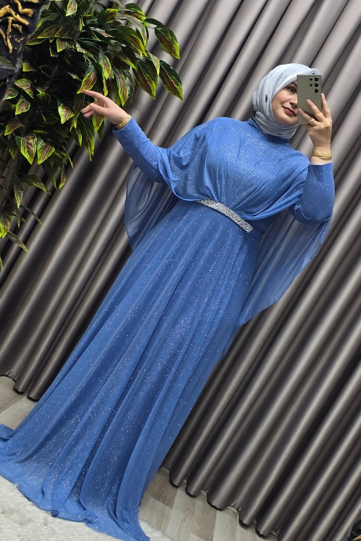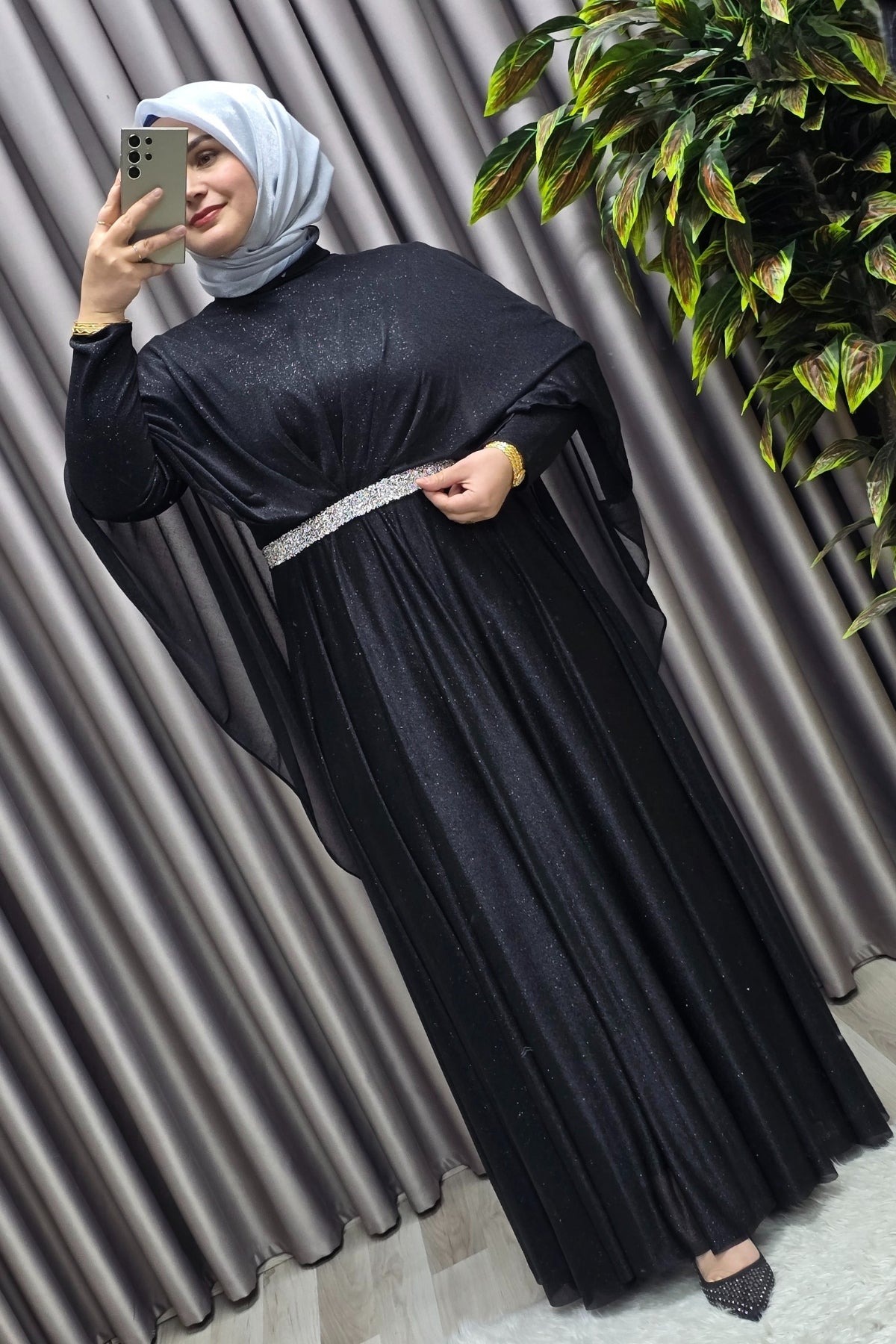 - Zarif renkleriyle göz alıcı bir görünüm sunan bu pelerinli abiye, her özel anınızda şıklığınızı tamamlar.