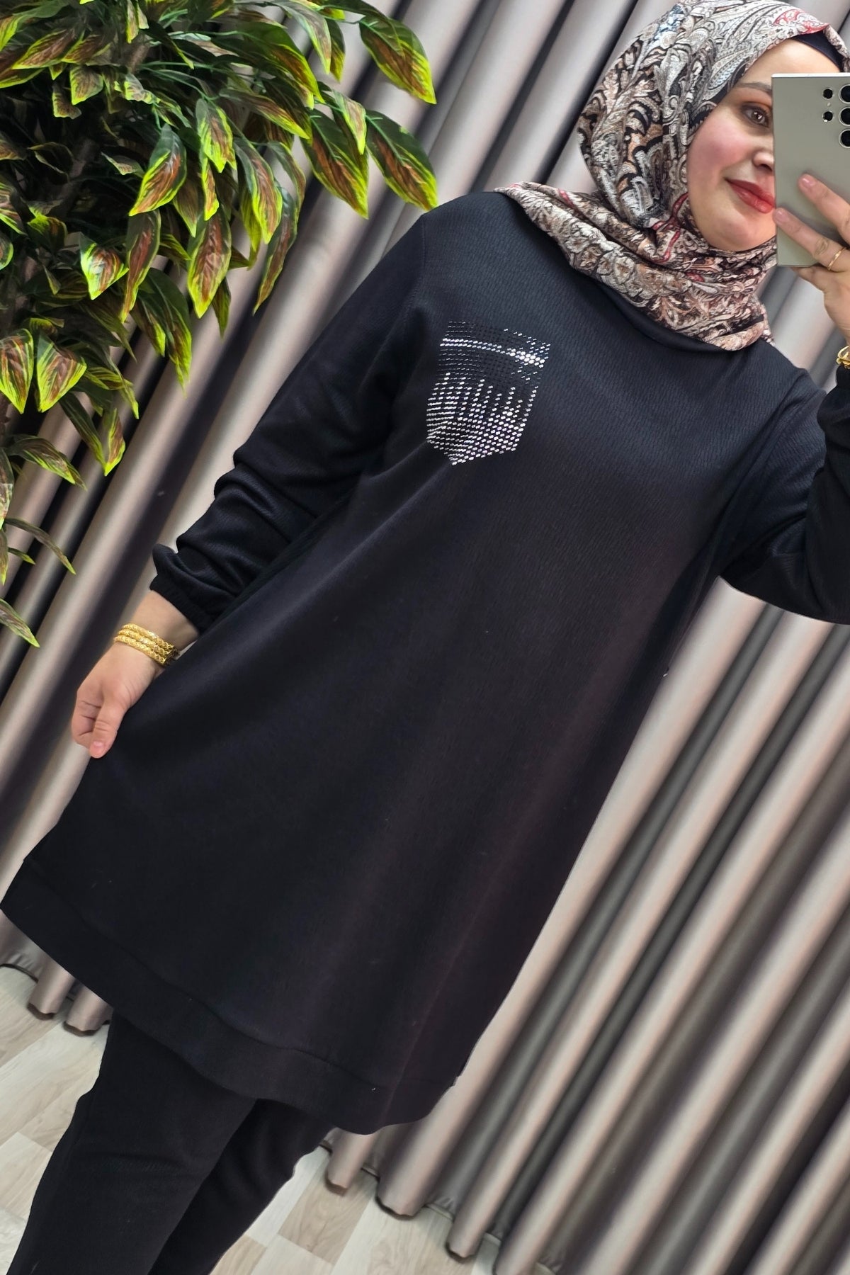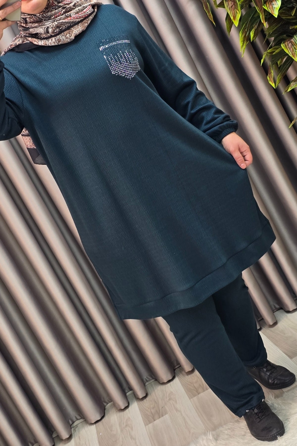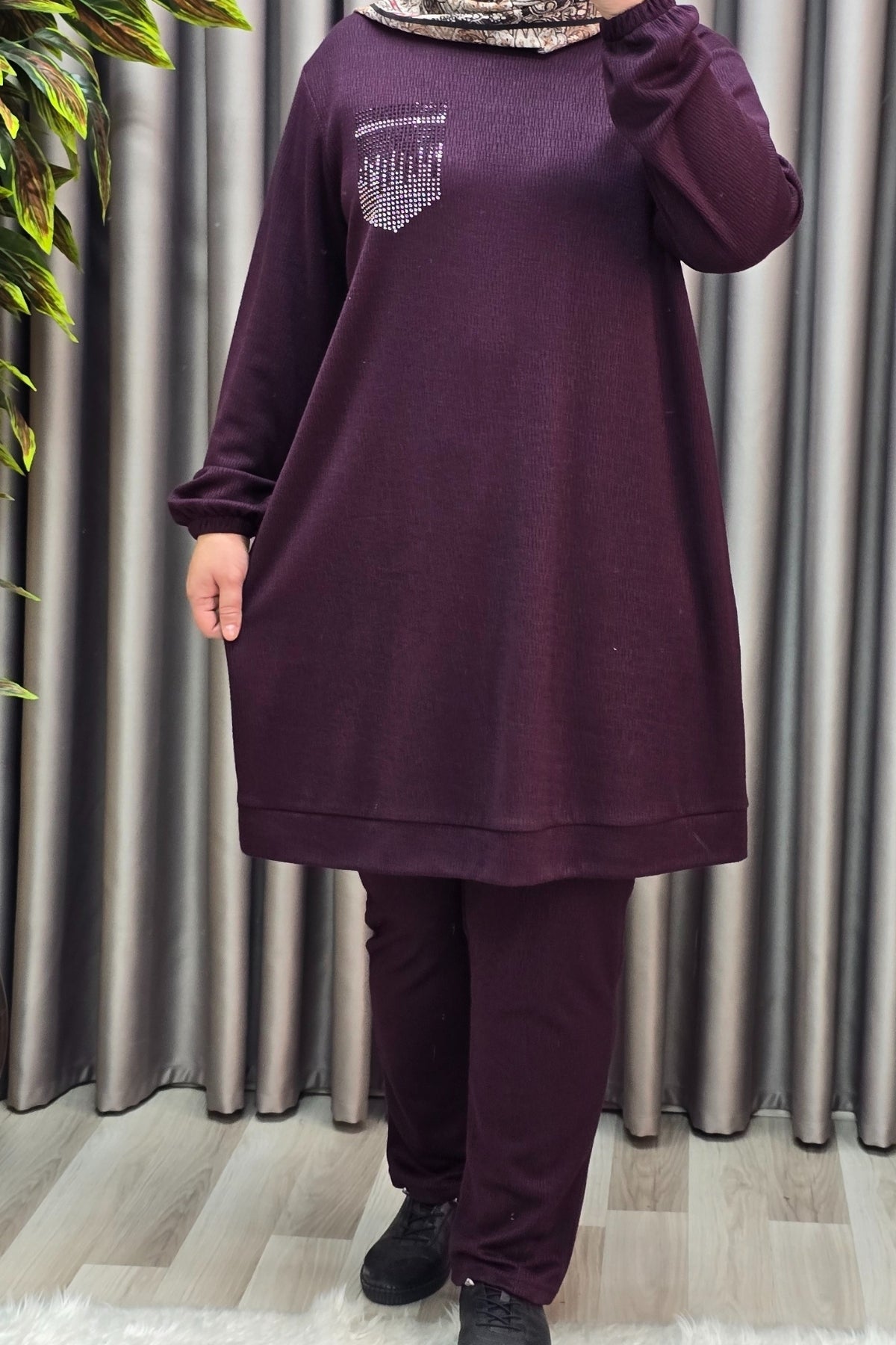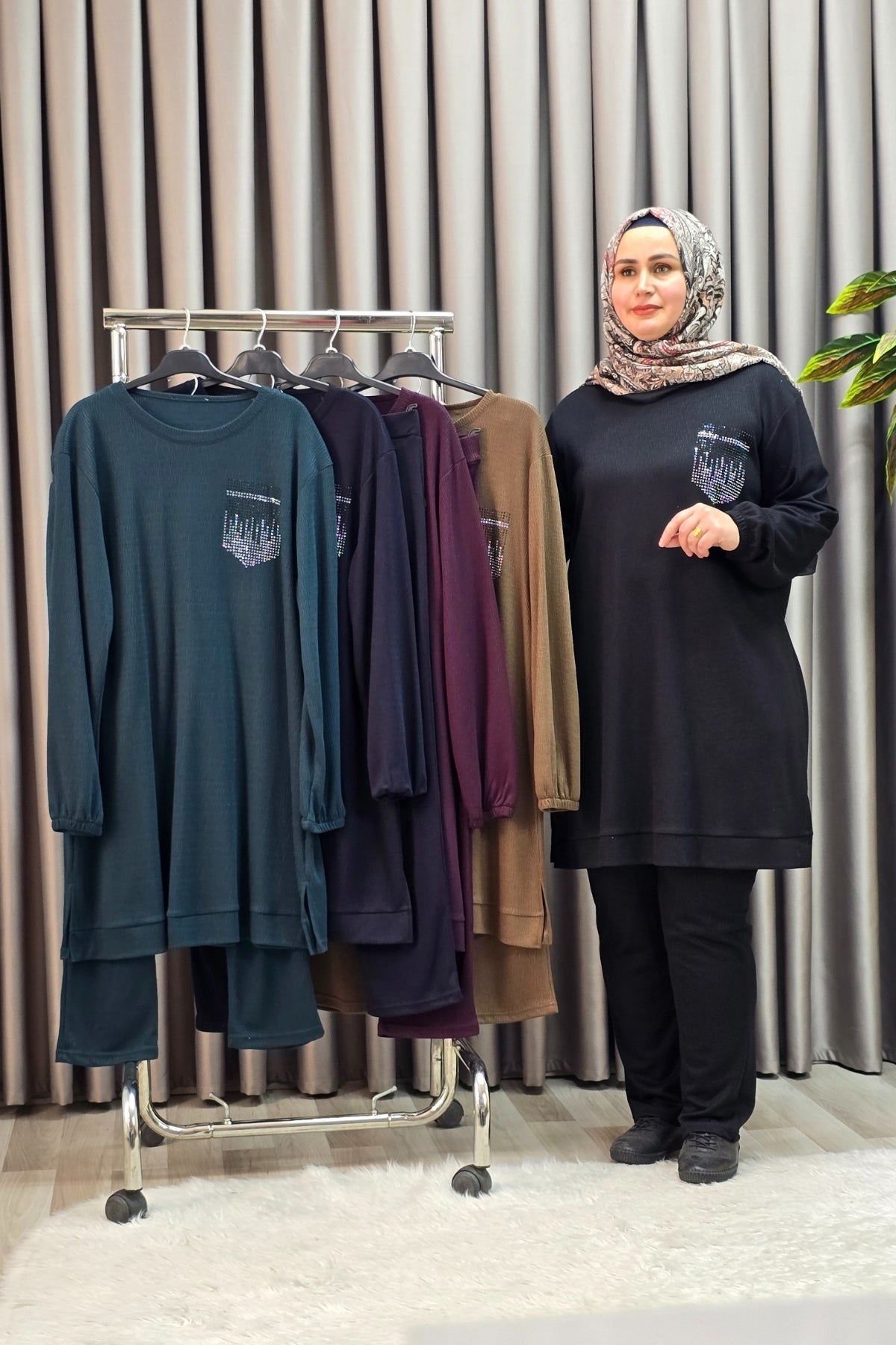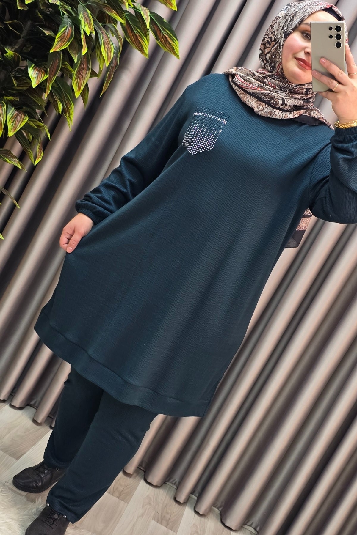 Kadın Tesettür Giyim Büyük Beden Cebi Taş İşlmeli İkili Takım