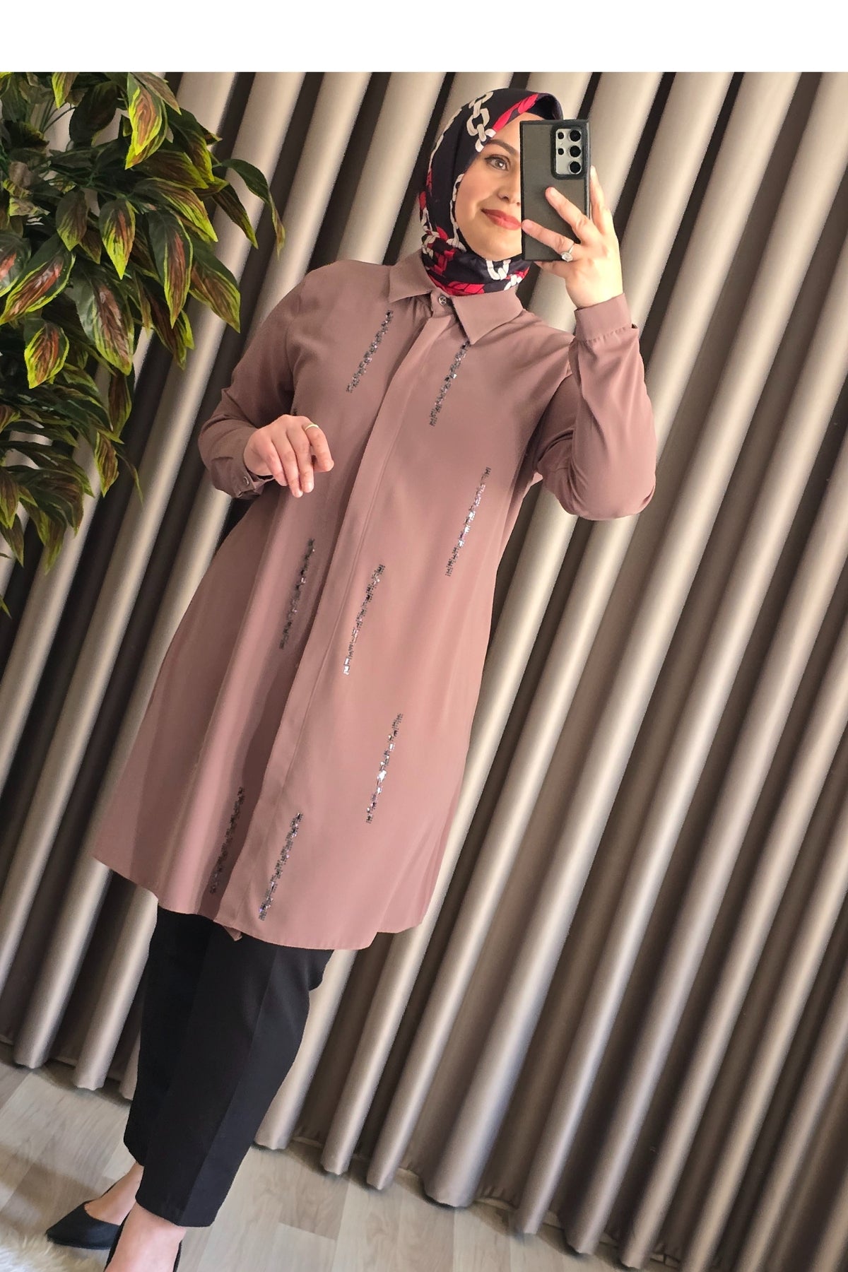Kadın Tesettür Giyim Büyük Beden Şerit Taşlı Krep Gömlek
