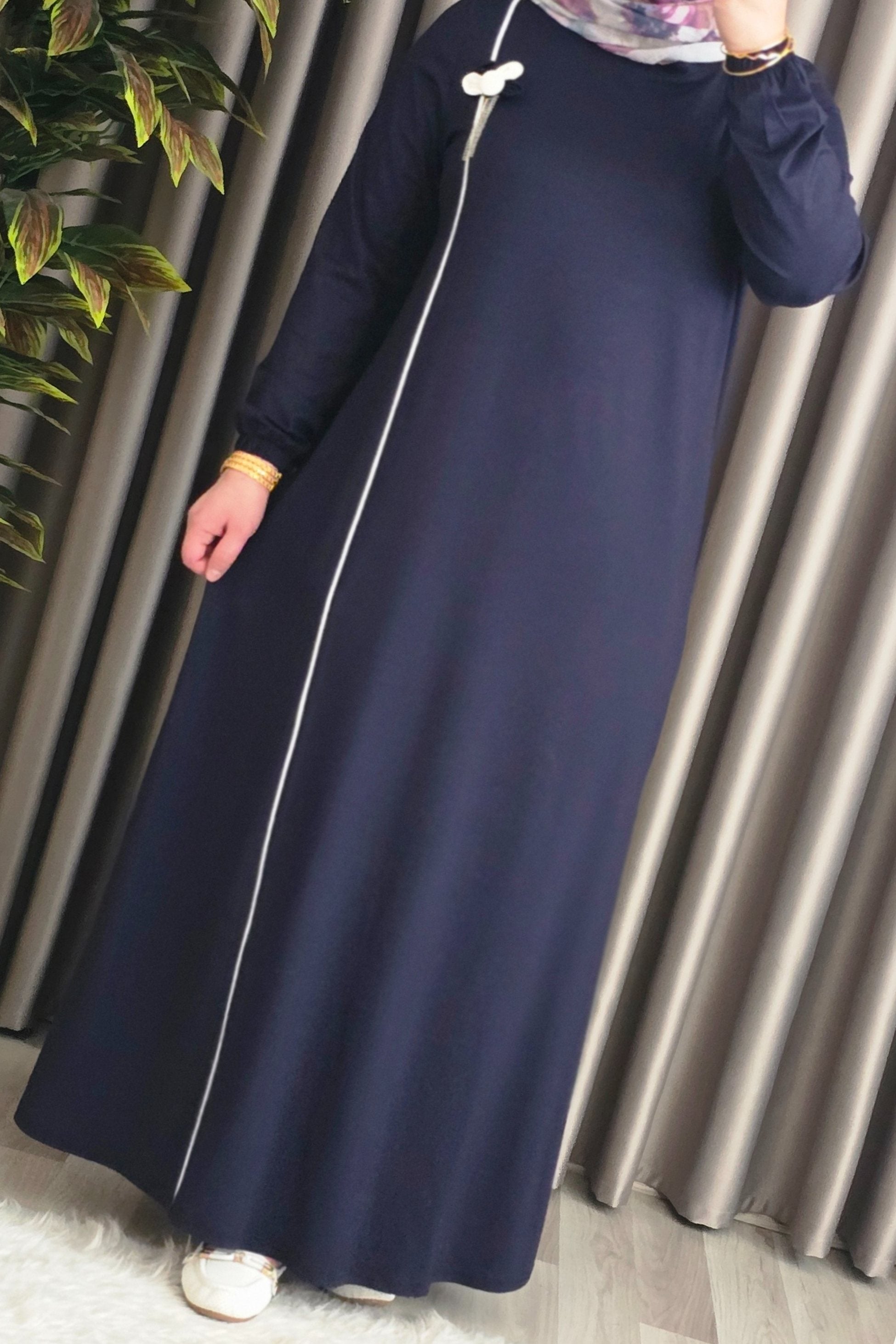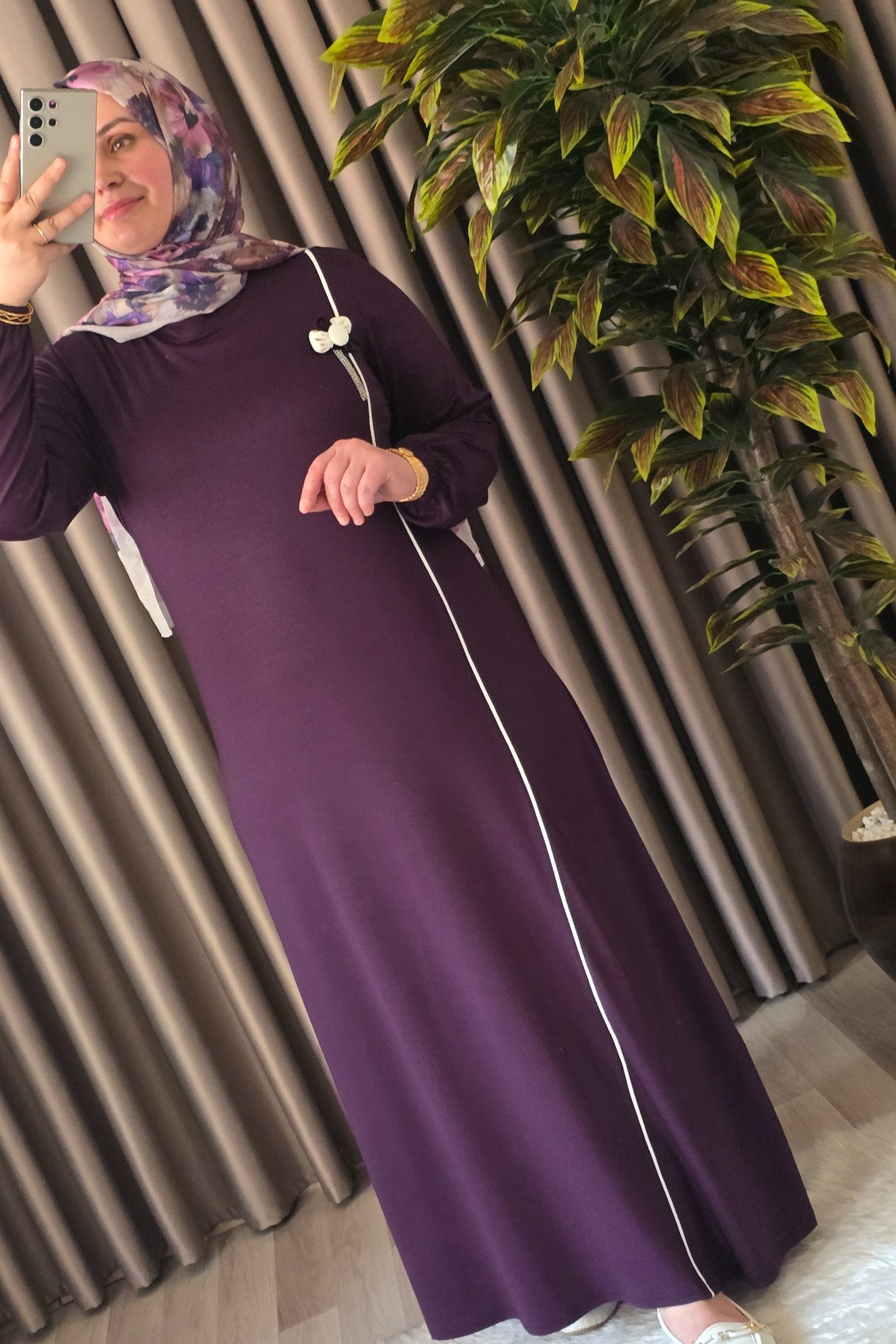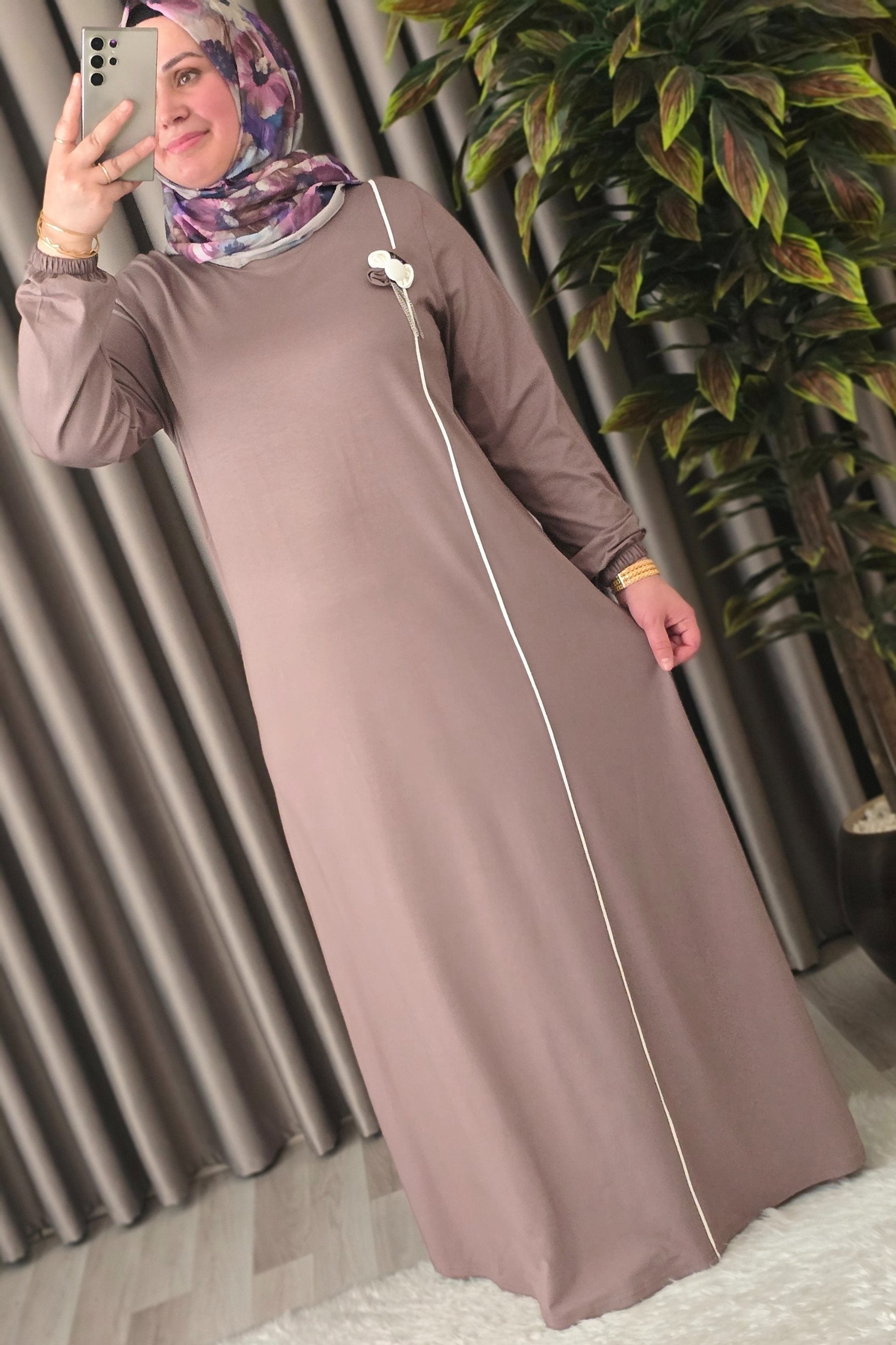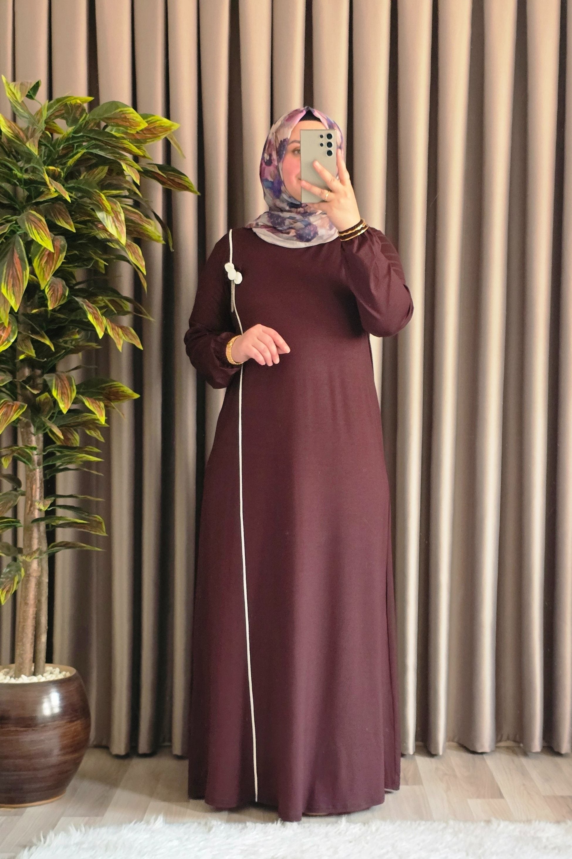 Rahat kalıbı sayesinde gün boyu konfor sunar; vücut hatlarını belli etmeyen dökümlü formu ile tesettür kombinlerinde zarif bir duruş sergiler. Uzun boy elbise formu, asil görünümüyle hem sade hem de şık bir alternatif oluşturur.